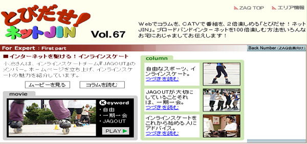 ケーブルテレビの 『とびだせ!ネットJIN』 の番組でJAGOUTと長居公園の取材がありました(^-^)v 長居公園で行われたロケでは「おはよう朝日です」や「ナイトinナイト」など多くの番組に出演されている 「楳崎静香(うめざきしずか)」さんや博士役の森野さんが来られてインラインスケートに初挑戦しました(~Q~; テレビ放送は終了しましたが、見れなかった方にCATV番組の画面スナップと一部映像をご紹介します!