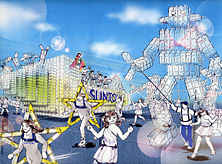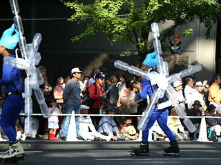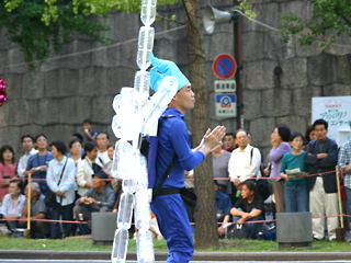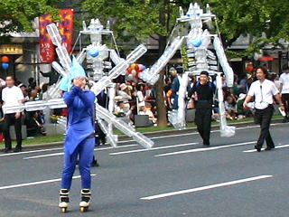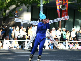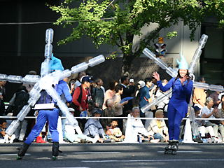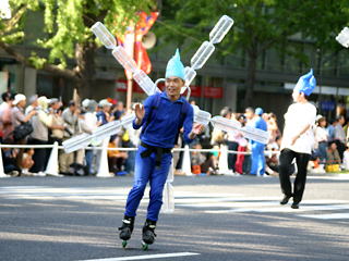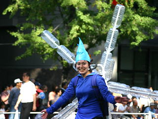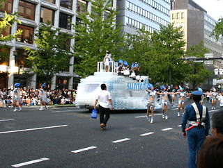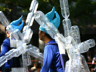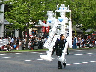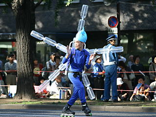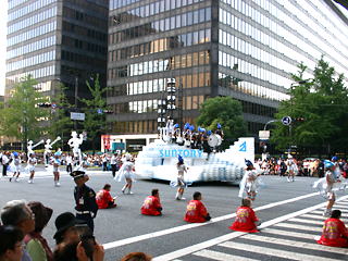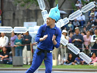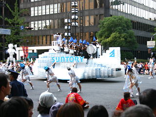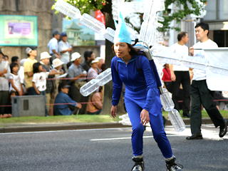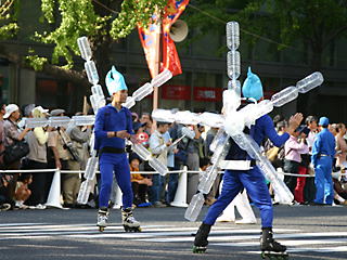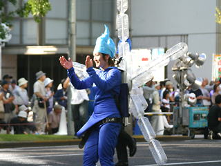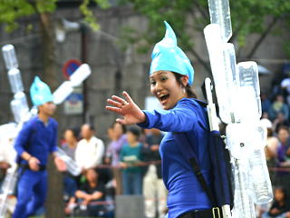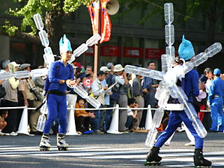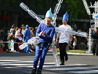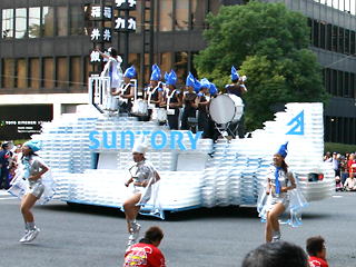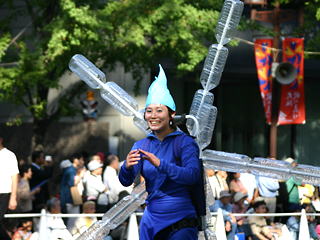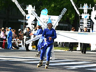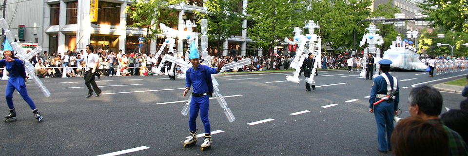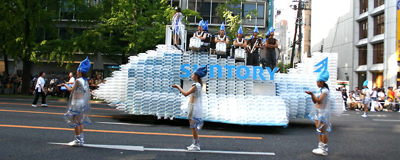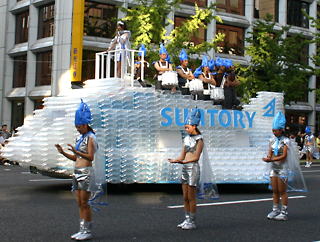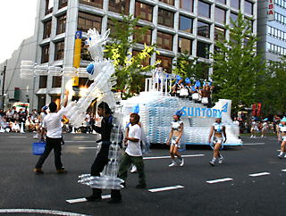 大阪の秋の風物詩「御堂筋パレード」。毎年120万人を超える観客を動員する、大阪の3大祭りとも呼べるパレードです。当日は大阪の大動脈御堂筋を、日本をはじめ世界各国の郷土芸能、華やかに装飾されたフロートやマーチングバンドがパレードします。この「御堂筋パレード」のフロート部門に今年もサントリーは出場します。 昨年見事グランプリを獲得したサントリーの今年のテーマは、「サントリー・ウォータープラネット・ファンタジー」。ペットボトルでできた、巨大な宇宙船やロボット達と共に、水の惑星からの使者たちが、水都OSAKAにやってきました。「水の惑星のプリンセス」は、2004サントリービールキャンペーンガール安田美沙子さん。水の惑星の使者たちのセレモニーがはじまりますよ。ユニークでちょっと不思議な水の世界を見にいらして下さい! 今回のフロートに使われたペットボトルは、新しい循環型リサイクル手法ボトルtoボトルで再びペットボトルに生まれ変わります。 |